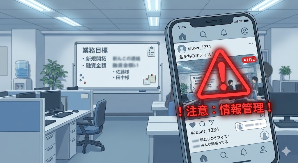 * **ホワイトボードの記載**: 「業務目標」や「新規開拓5件」といった内部情報のほか、個人名や融資金額とみられる数字が確認されました。